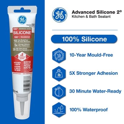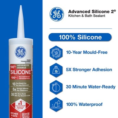 Advanced Silicone 2 Kitchen & Bath sealant is a high-performance, 100% silicone and 100% waterproof sealant ideal for areas prone to water exposure. Advanced Silicone 2 Kitchen & Bath sealant is permanently flexible with 40% more flexibility than Class 25 sealants and has 5X stronger adhesion than Silicone 1* sealant. Its 30-minute water-ready formula offers 10-year mould-free product protection to protect against mould and mildew growth. Backed by a lifetime guarantee.