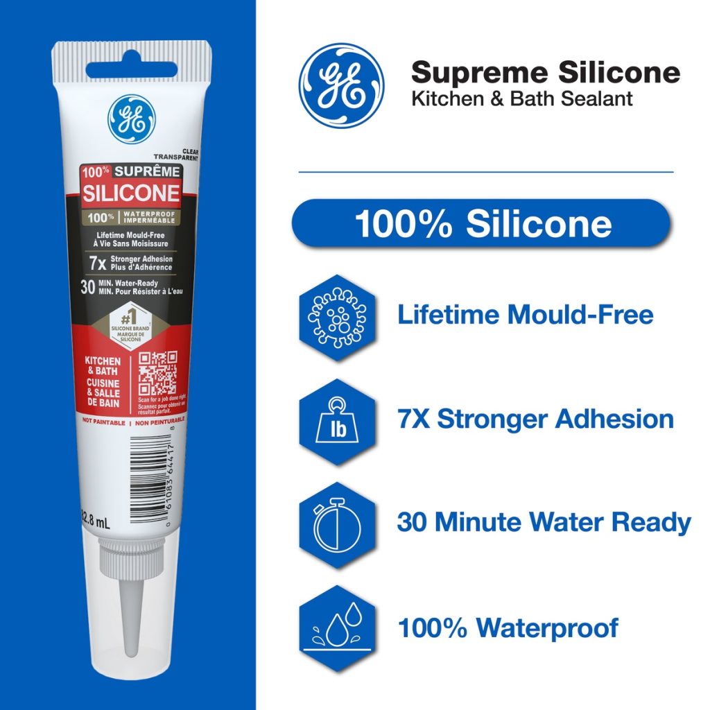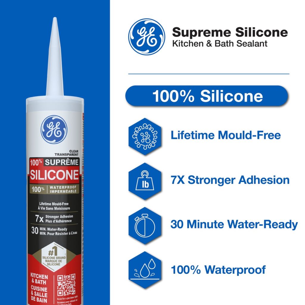 Supreme Silicone Kitchen & Bath sealant is a premium, 100% silicone and 100% waterproof sealant ideal for areas constantly exposed to moisture. This 30-minute water-ready formula has 100% more flexibility than Class 25 sealants and has 7X stronger adhesion than Silicone 1* sealant. It offers 50% joint movement capability for a shrink and crack-proof seal. This sealant also resists mould and mildew growth with lifetime mould-free product protection. Backed by a lifetime guarantee.