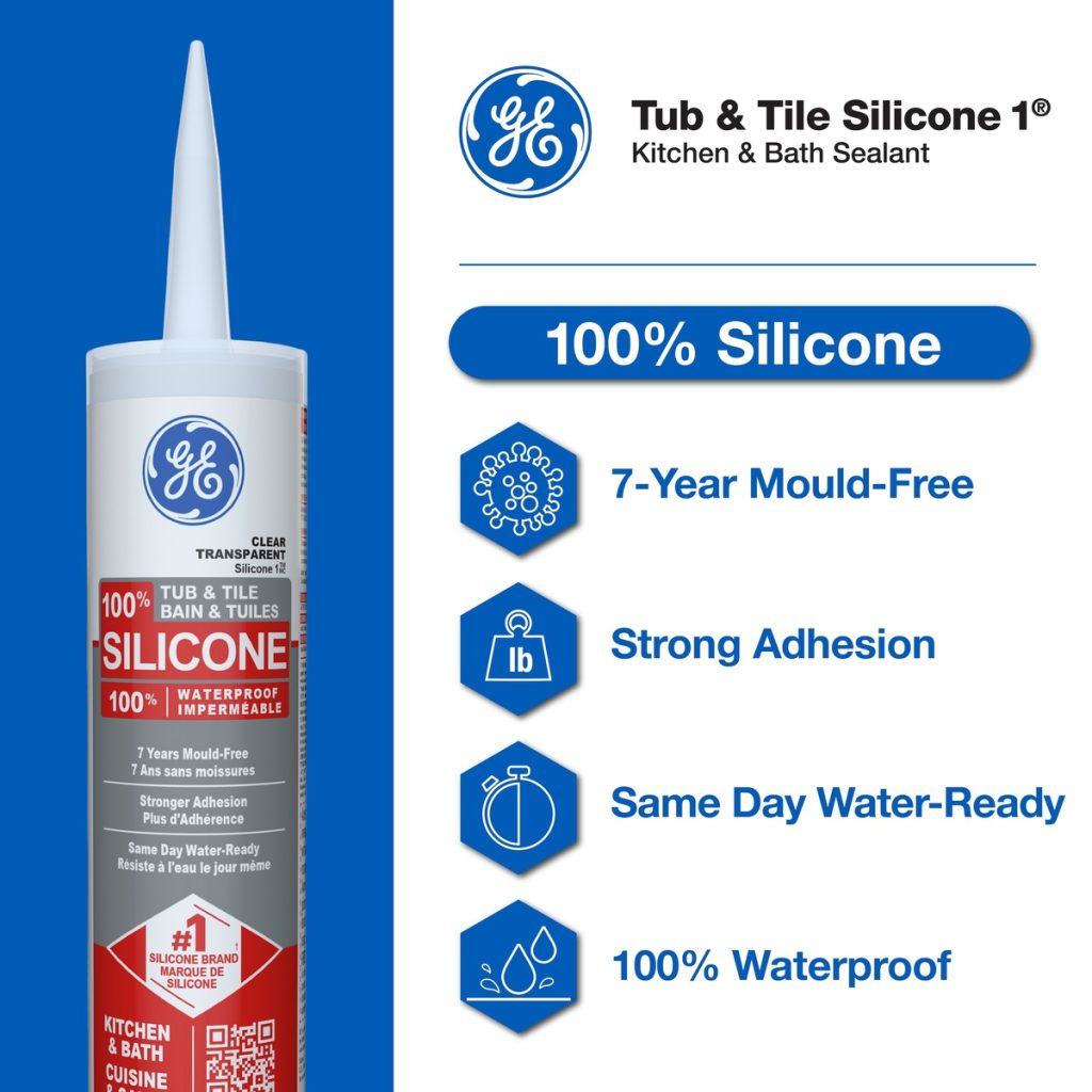 Tub & Tile Silicone 1 sealant is a 100% silicone and 100% waterproof sealant ideal for areas susceptible to moisture like sinks, tubs, showers, fixtures, countertops, backsplashes and plumbing projects. Tub & Tile Silicone 1 sealant is flexible with strong adhesion and resistant to stain-causing mould and mildew growth with 7-year mould-free product protection. Backed by a lifetime guarantee.